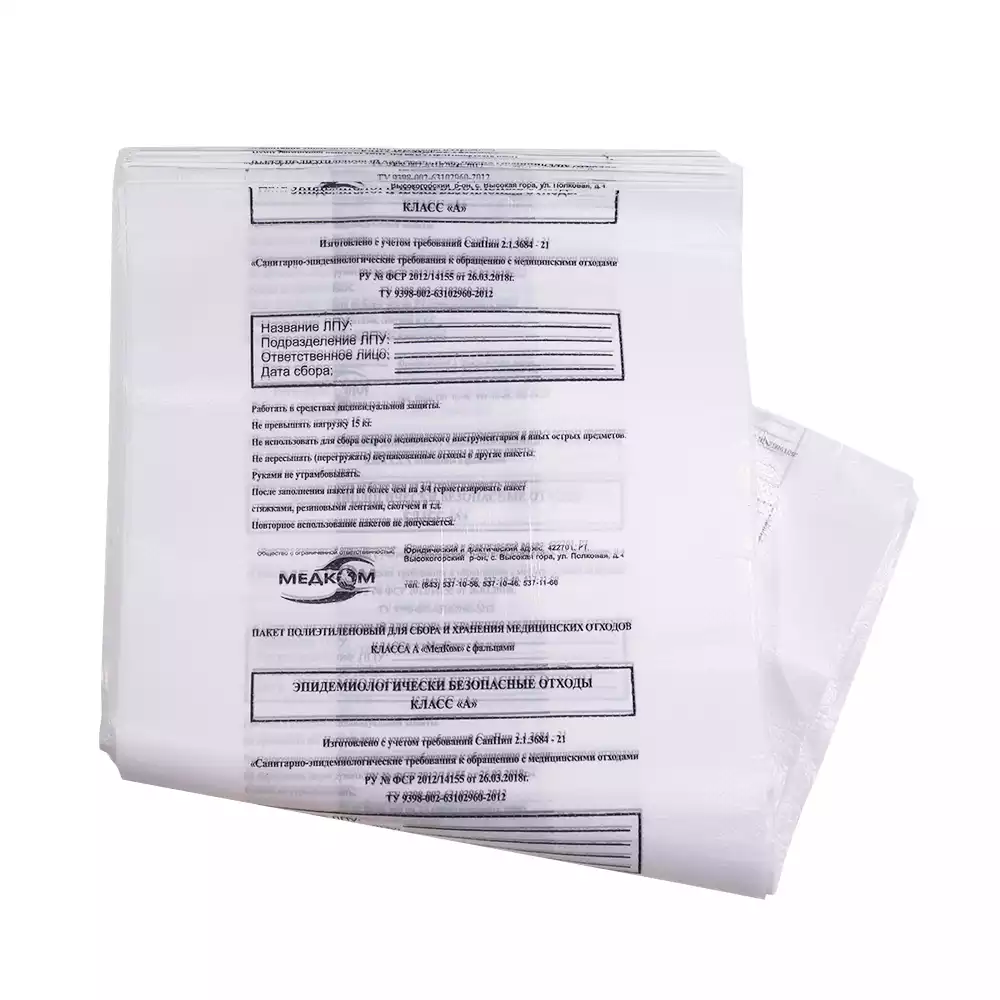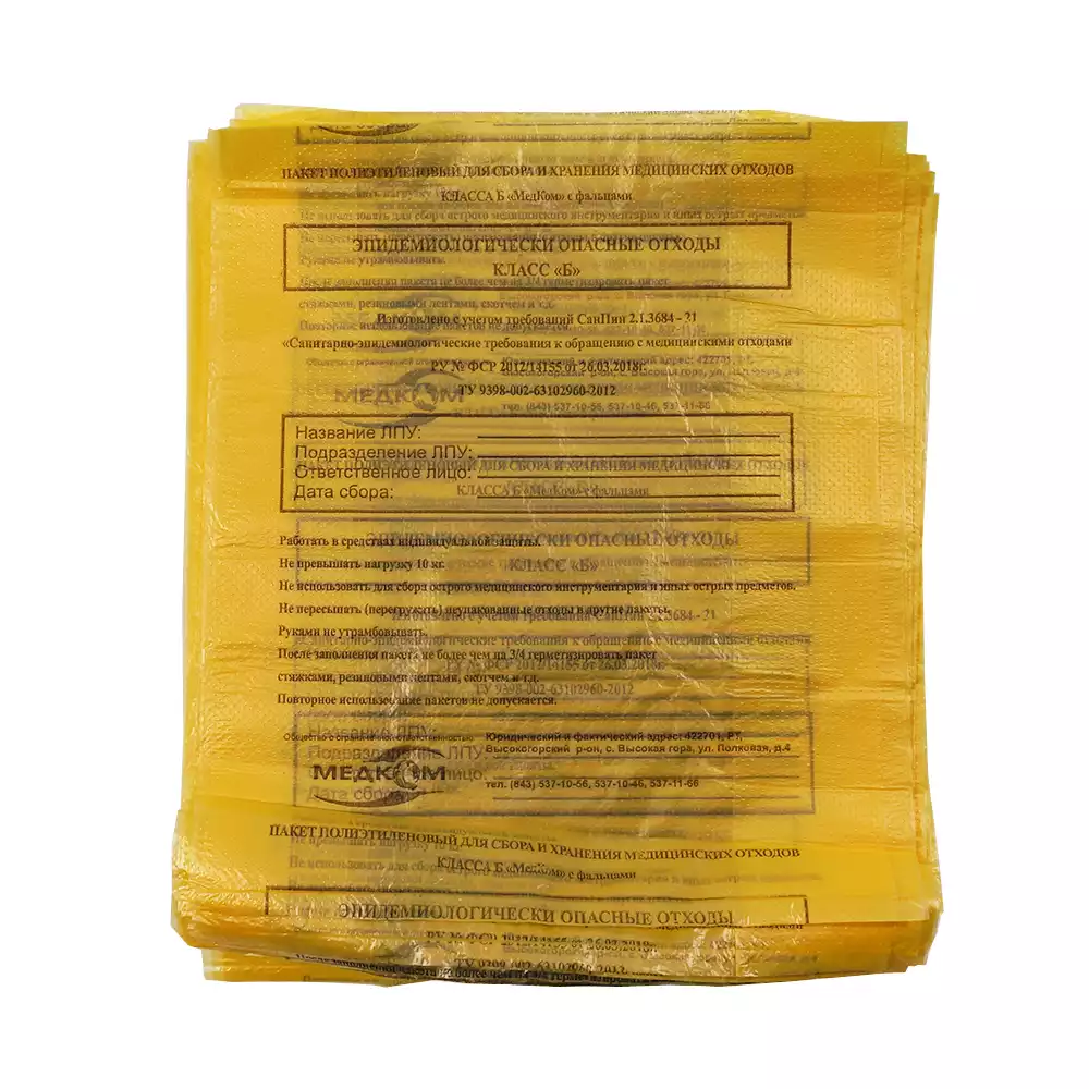 Пакет для сбора медицинских отходов, класс Б (желтый), размер 500х600мм, объем 30,0л, плотность 11 микрон