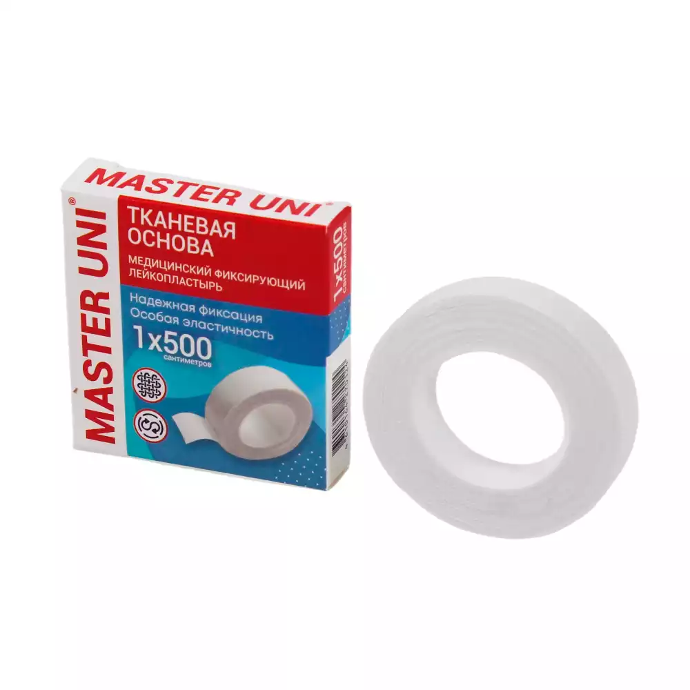Лейкопластырь Master Uni на тканевой основе (хлопок), фиксирующий, размер 1см*500см, катушка в картонной коробке, ООО "ХЕЛСЛАБ" (РОССИЯ)