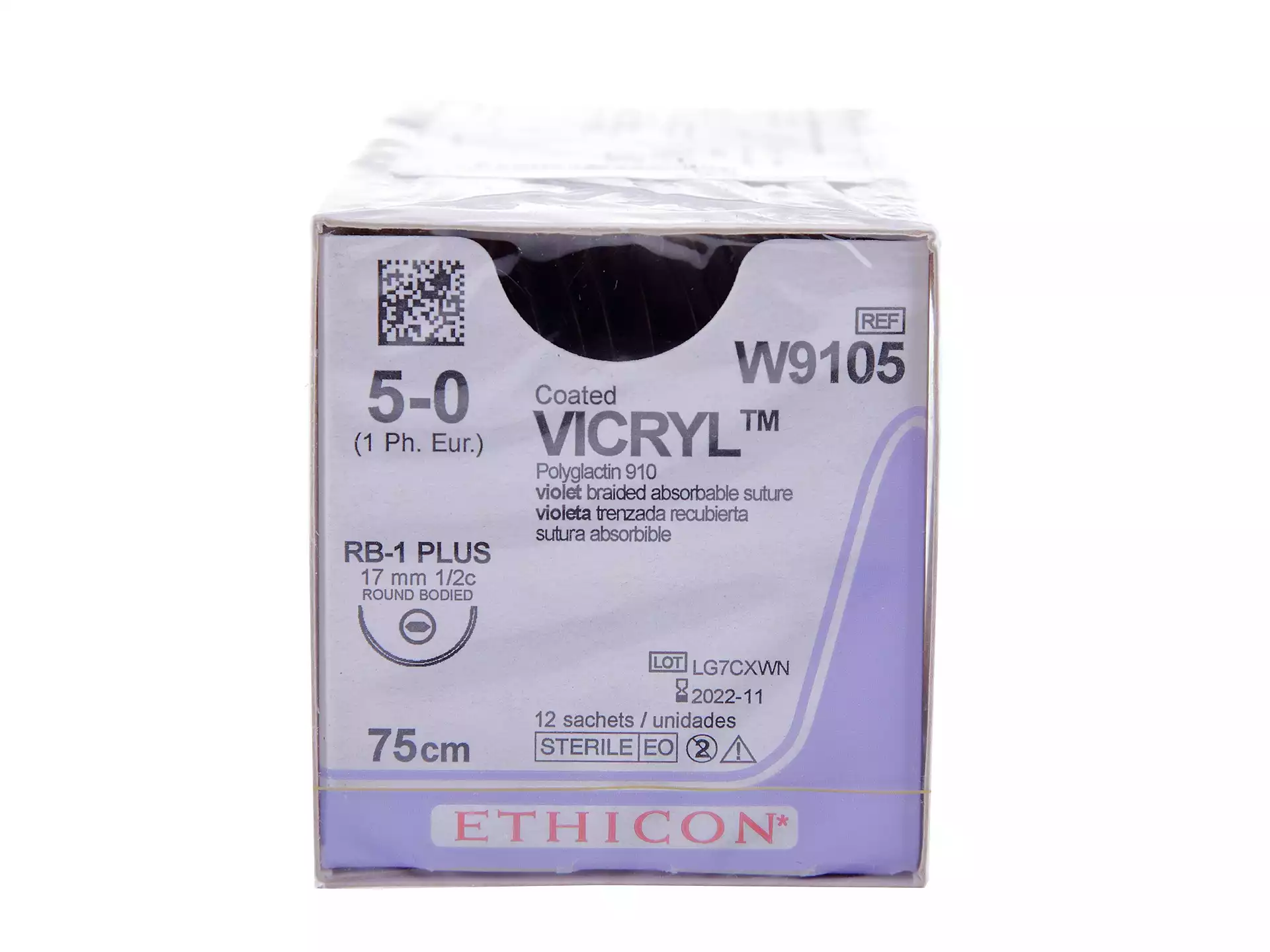 Викрил М1 (5/0), длина 75см, игла колющая RB-1 Plus 1/2 окружности 17мм, фиолетовый, упаковка 12шт, W9105 (строго под ЛПУ), ETHICON (БЕЛЬГИЯ)