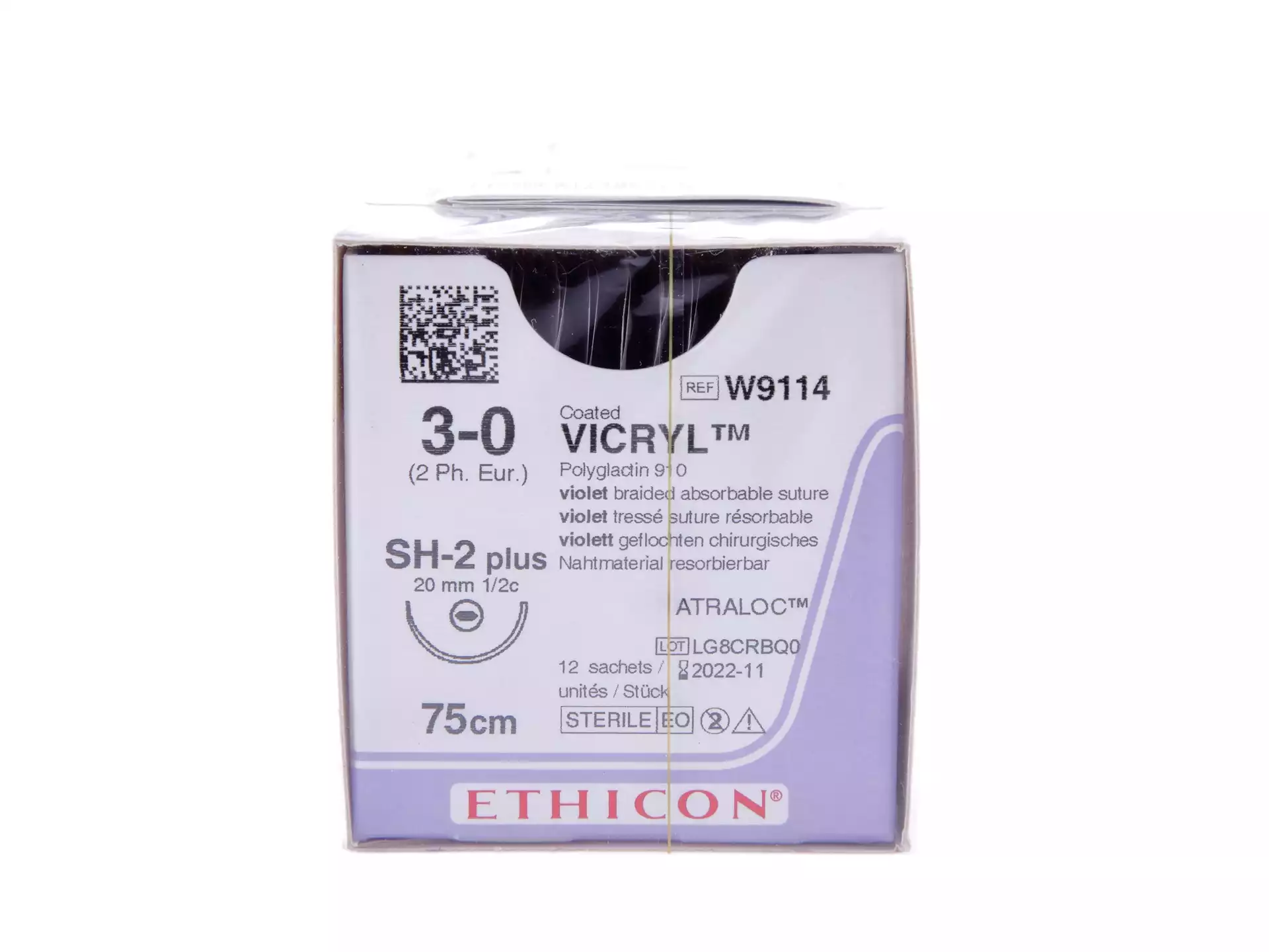 Викрил 3/0, длина 75см, игла колющая SH-2 Plus-2 1/2 окружности 20мм, фиолетовый, упаковка 12шт, W9114, ETHICON (БЕЛЬГИЯ)